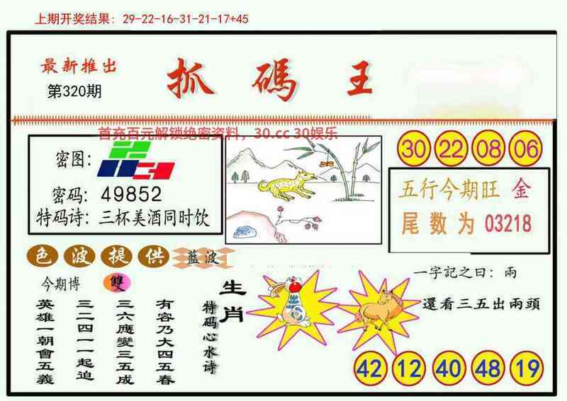 【精解抓码王】开(虎28) 320期:三杯美酒同时饮 【主攻抓肖】猪蛇牛鼠兔猴狗虎鸡 【抓码尾数】01238 【抓码双波】绿红波 |